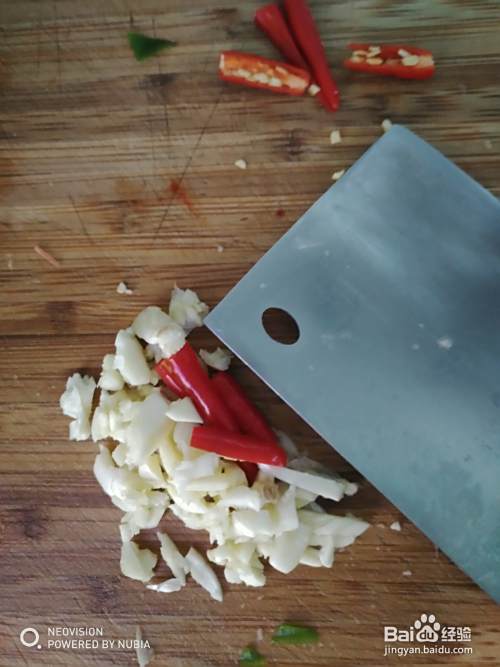 第二步,准备好蒜和红辣椒,把蒜切碎。