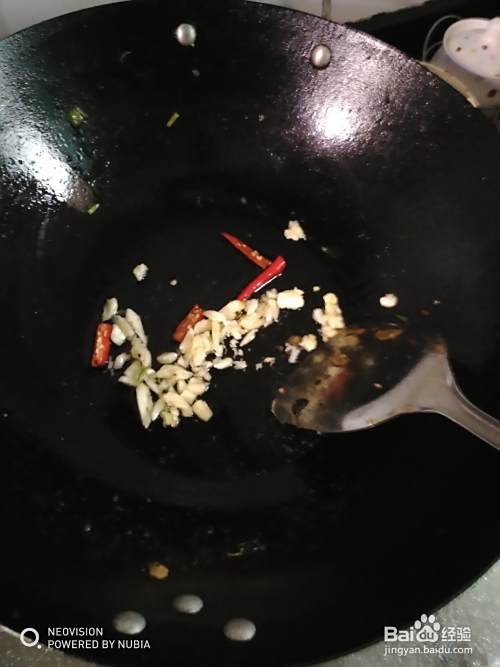 第三步,在锅里倒入适量花生油,等油七八分熟以后倒入蒜和红辣椒。