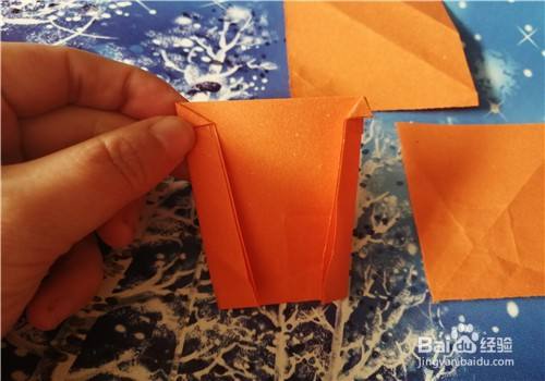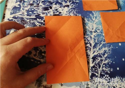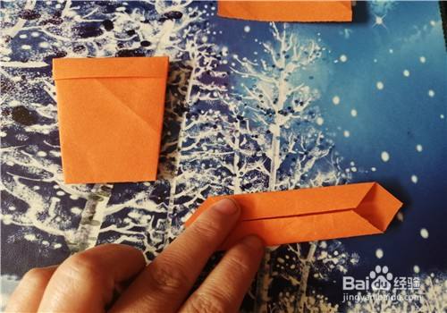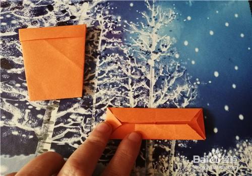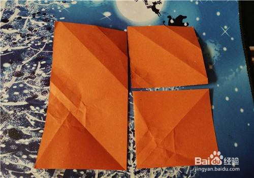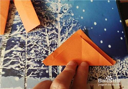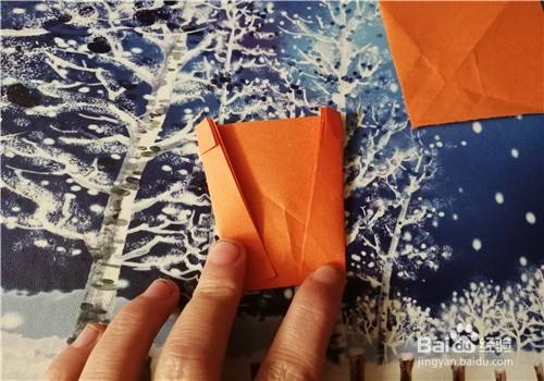 然后,再把右侧的边向左折,翻到正面放到一边。我们再把小的彩纸两角对折,如图三。