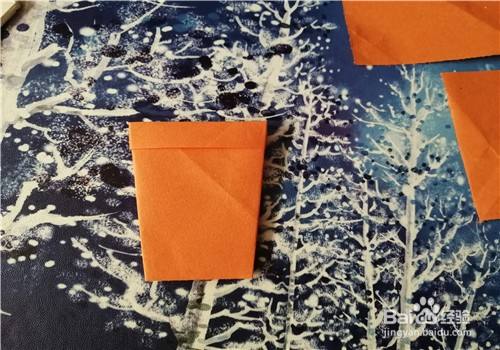 再取另一张彩纸,把下侧的角上折,如图二。翻到另一面后,把下侧的边一直向上卷,最后用手工胶粘住,如图三。