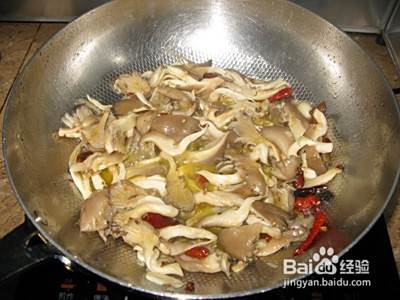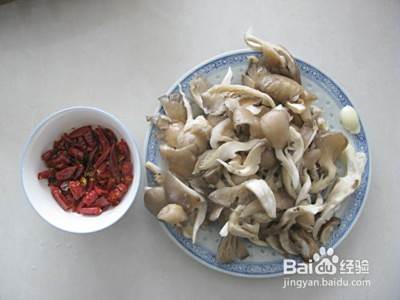 准备食材:平菇洗净撕成小朵,挤挤水份。蒜切片,干辣椒切段。