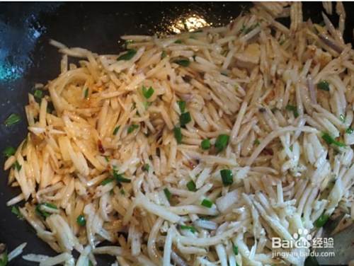 锅中放油烧热,放入芋头丝去炒,炒变色后再放入水去煮,水量要没过芋头丝,再放入盐,把水煮干撒入葱末起锅就可以了。