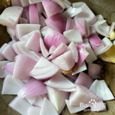 准备一个大洋葱,先切成宽一点的条,再切成方块,之后准备姜片,还有蒜瓣。弄好之后都均匀的洒在砂锅里面。