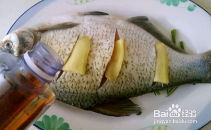 清洗干净的鱼放进盆中,放入葱段,再放入姜片,之后倒入适量的料酒,放入盐 胡椒粉,再放入一些蚝油,充分地抓拌均匀。