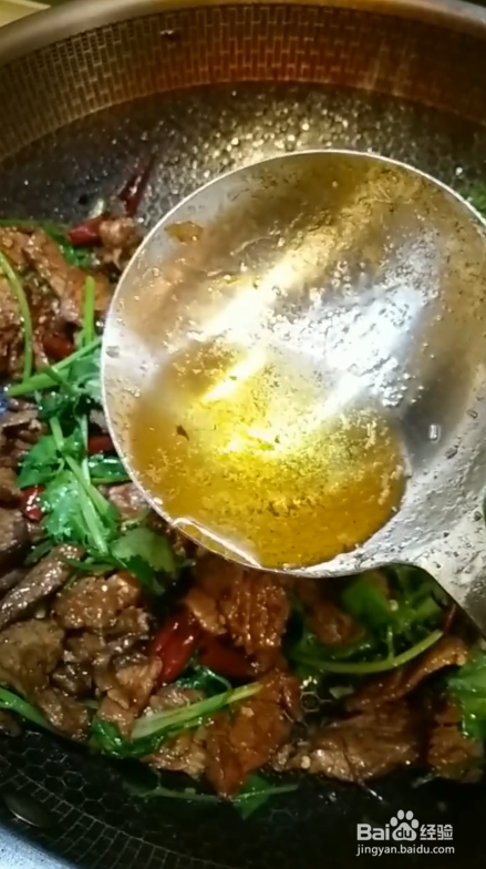 稍来点生抽,蚝油和老抽,加入冰糖和香菜段,加入精盐和味精调味,出锅前加入少许麻油,翻炒出锅即可。
