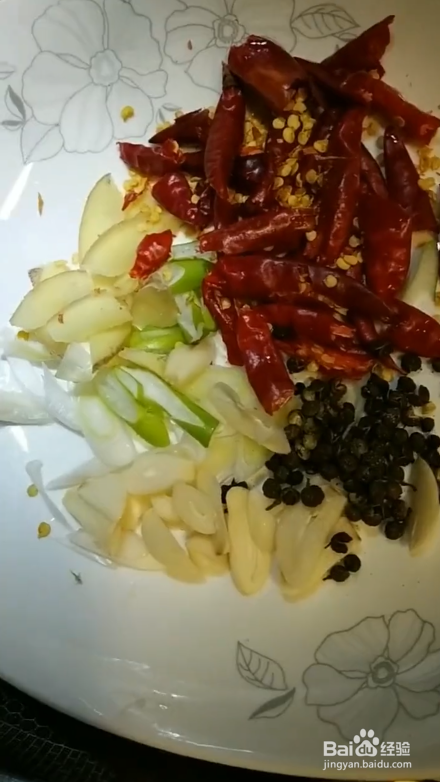 然后下入葱姜蒜,干辣椒和麻椒,翻炒均匀后来点十三香。