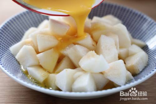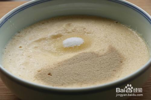 3、搅打好的梨子汁倒入大碗中,加入酵母和白糖,搅拌均匀;鸡蛋和梨子汁的重量在450克左右;
