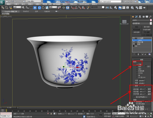 将设置好的青花茶碗材质附加给茶碗模型后,选中模型,点击【UVW贴图】,勾选【平面】并设置好平面的各个参数即可。以上就是关于3Dmax青花茶碗模型制作方法的所有介绍。