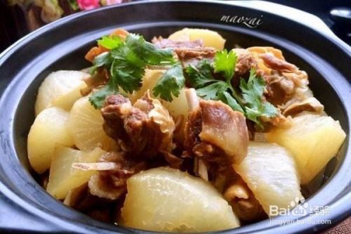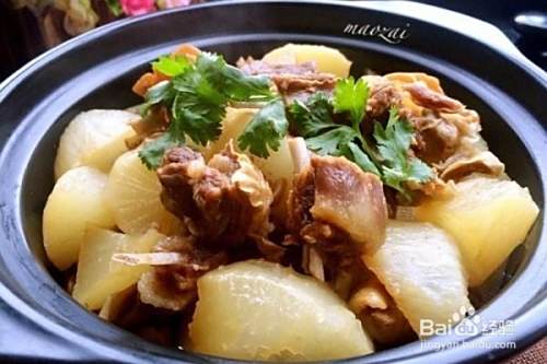 五,制作阶段第二步:将羊腩转移到热好的砂锅中,加入没过羊腩的水分和加入八角,花椒,肉桂皮,豆蔻等配料拌匀,汁水烧开之后调小火焖煮40分钟,加入白萝卜块,再焖煮25分钟,这道香喷喷的家常萝卜焖羊腩就完成了。最适合这个季节的一道进补菜了,各位朋友可以试一试哦!