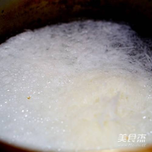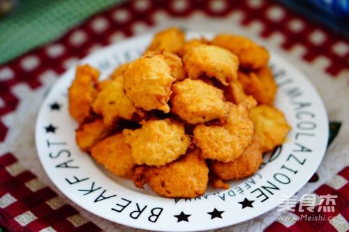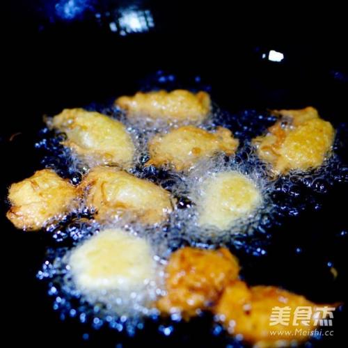 8锅中中火热油,筷子放油锅周围有小气泡就可以挖一个丸子下锅了,慢炸成金黄色。