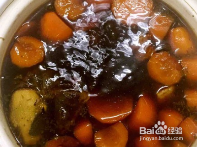 大火烧开后,加入滚刀切的胡萝卜,小火慢炖一小时半以上