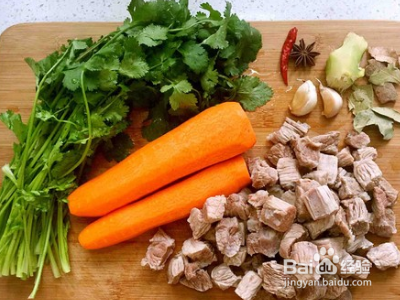 胡萝卜、香菜清洗干净;其他辅料用纱布包包起来