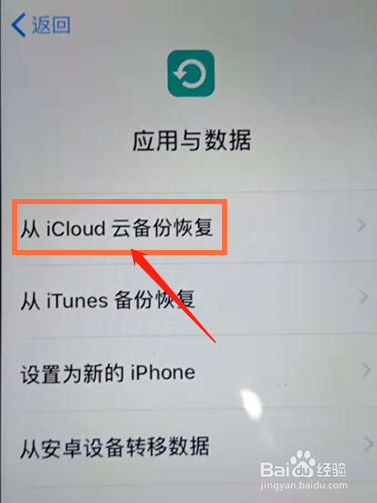 待手机页面进入到应用与数据的界面后,我们会看到里面有个从icloud云备份恢复的选项,直接恢复就可以了。