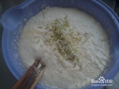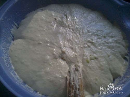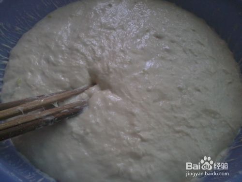 加入温水,边加水边搅拌。比包水饺的稀软一些,但比做面糊饼的面糊要稠。使劲搅动,面越上劲越好。这个活儿可以交给家里的男人去做,挺累人的。一直到面团表面非常平滑,一点小疙瘩也没有。