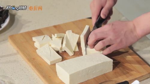 1把豆腐切成三角片,厚度在0.8厘米。