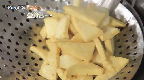 7豆腐炸至金黄,外皮定型。