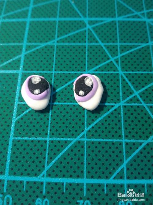 用白色、紫色、黑色粘土及高光笔制作眼睛,如下图