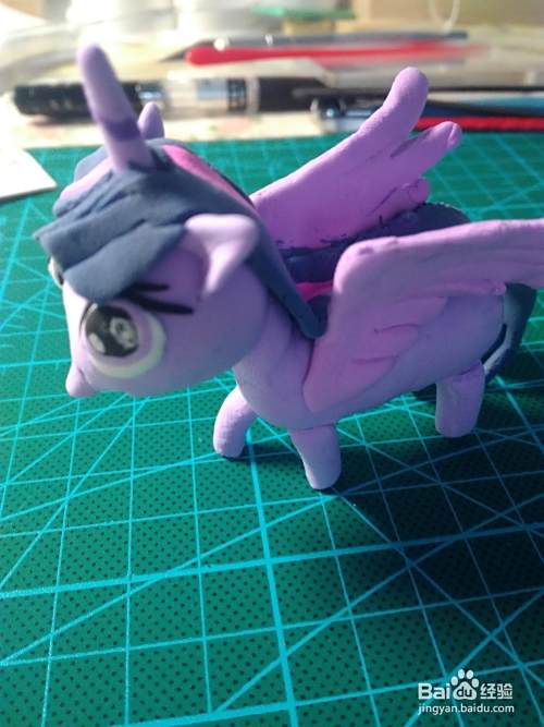 最后制作毛发,藏蓝色和玫红色的粘土做成条状,压扁,前面的刘海部分剪齐并剪开,末端也用剪刀剪开,将其整个的粘在小马的头、背、屁股上,紫悦就做好了