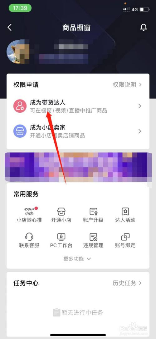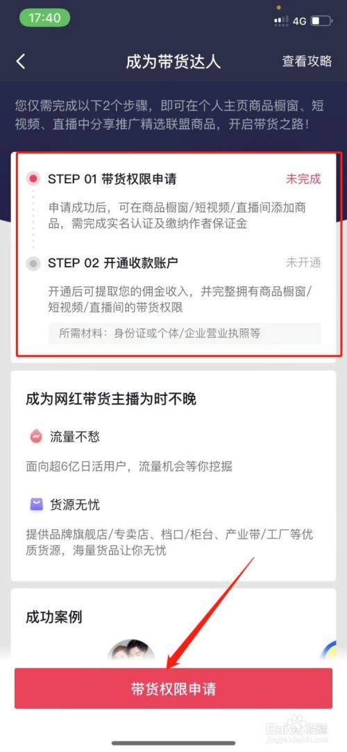 在开通界面可以看到需要申请开通带货权限和完成开通收款账户权限就可以开通了,点击下方申请带货权限即可进入开通。
