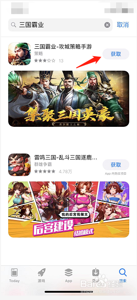 这时会跳转界面,界面上显示的有三国霸业的APP,点击旁边的<获取>就可下载该APP,下载完成后右侧显示<打开>字符就代表下载成功了。