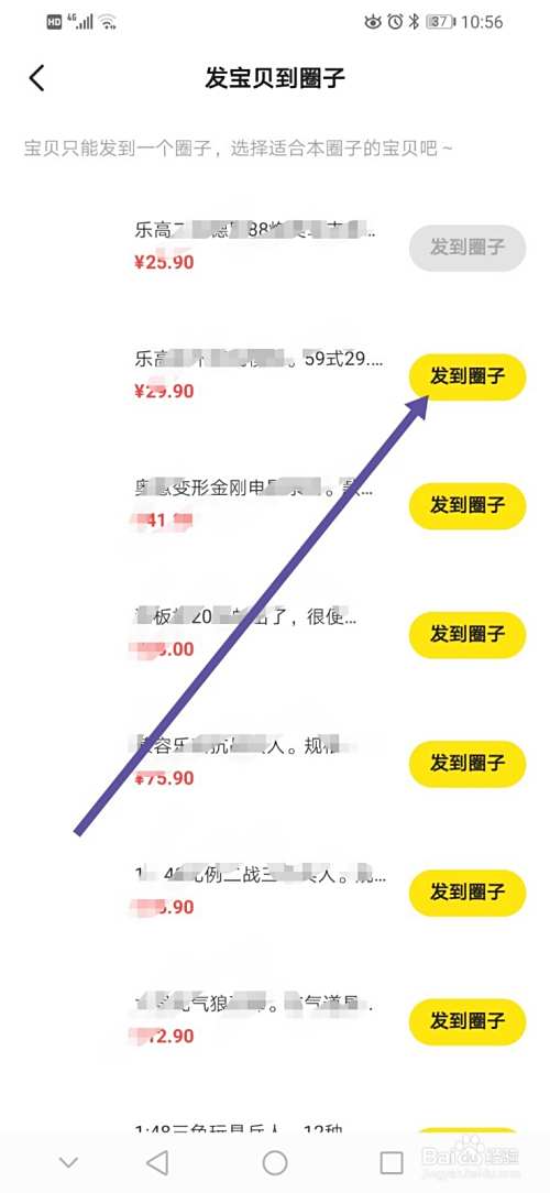 选择一个宝贝,点击后面的发到圈子,便操作成功了。