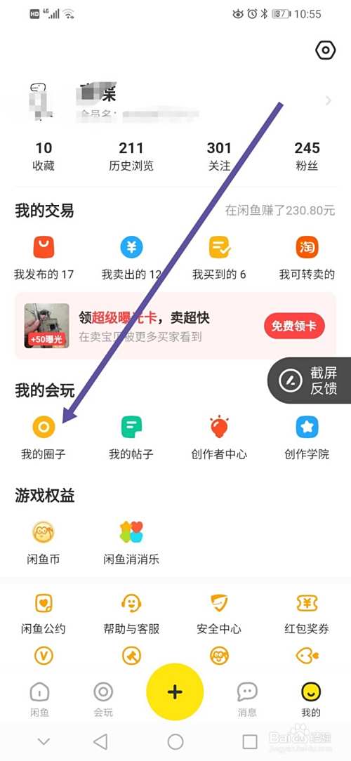 进入闲鱼个人后台,点击我的圈子,如图所示。