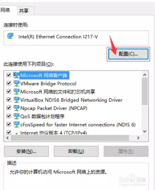 第四步,进入属性之后,勾选“microsoft”,点击“配置”。