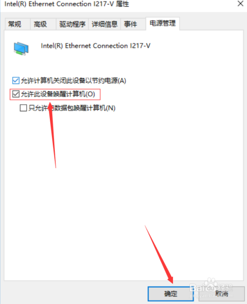 第五步,打开“属性”,点击“电源管理”,勾选“允许此设备唤醒计算机”。