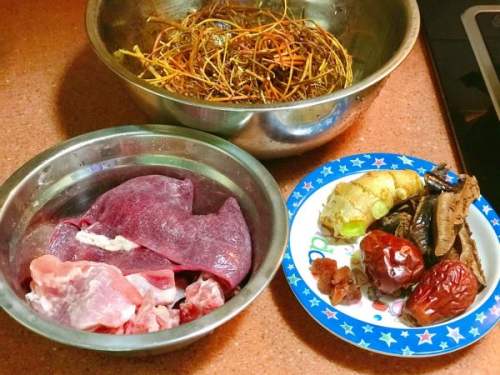 6先把洗干净的鸡骨草放入炖盅里,接着放入猪骨瘦肉猪横利,最后放入灵芝红枣等材料,加入适量的清水,盖上盖子,按炖汤键。