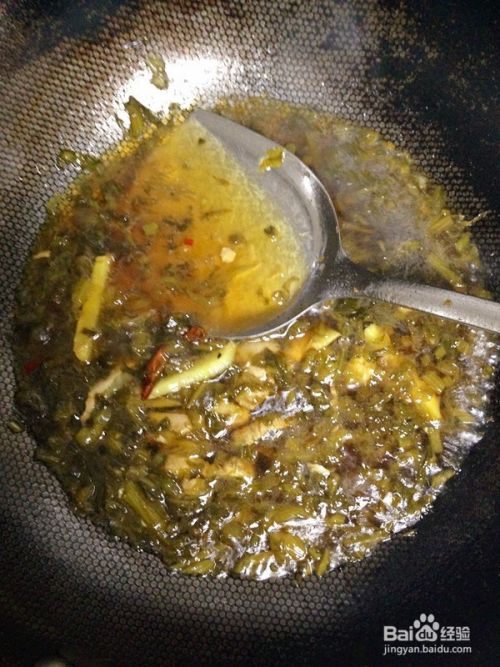 把雪菜倒入油锅,翻炒均匀后,加入适量水,再分别加入1小勺料酒、生抽、白糖和1个干辣椒,大火煮开。
