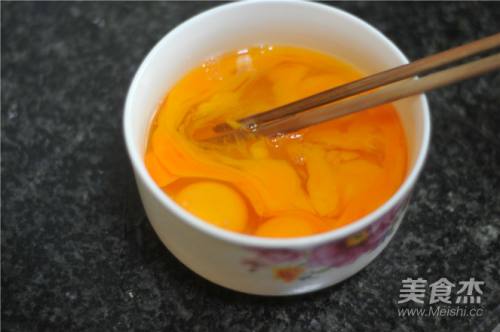 3将鸡蛋打在碗里,用筷子朝一个方向快速地将鸡蛋液打散,加入一点盐,搅拌均匀备用
