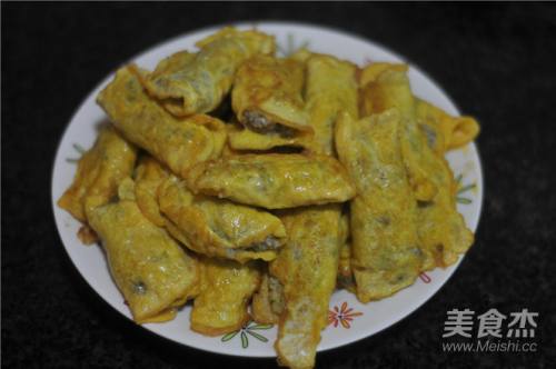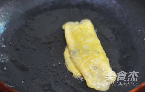 7用锅铲放在有肉馅的蛋饼下面,轻轻翻转,将肉馅包裹起来,收口朝下,稍微煎制定型