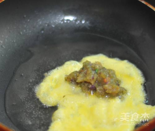 6锅里稍微放点油,烧热,舀一勺鸡蛋液放在里面,马上调节操作旋钮,将火调小,轻轻转动下锅,让蛋饼的形状更漂亮,蛋液微微凝固,表面稍微有点流动状的时候,夹起一坨馅料放在蛋饼的一边