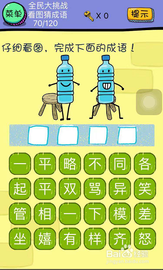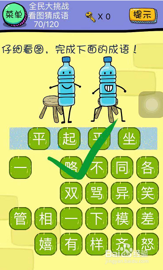 看图猜成语是我最近常玩的游戏,有的关卡比较难,下面和大家分享全民大挑战看图猜成语第70-71-72关怎么过