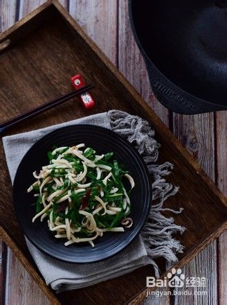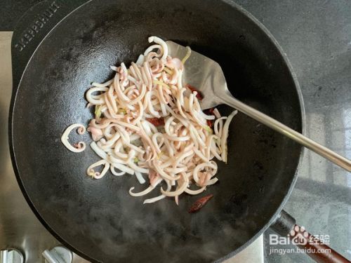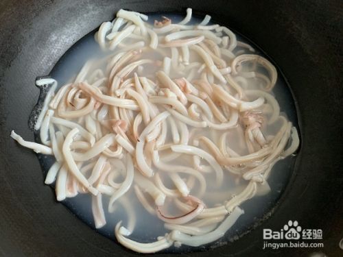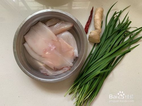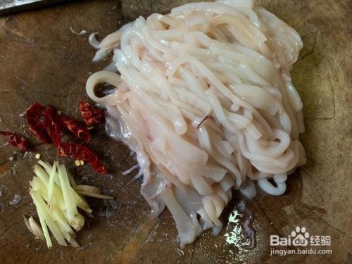 鱿鱼切成丝,姜切细,辣椒切段,备用。
