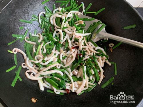 鱿鱼翻炒几下就可以了,不能炒得时间太长,这时将韭菜下入,爆炒几下就行,一定不能炒得火大,那样韭菜就不好吃了。