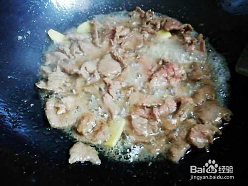 起油锅,放入姜片爆香,放入牛肉滑炒至变色。
