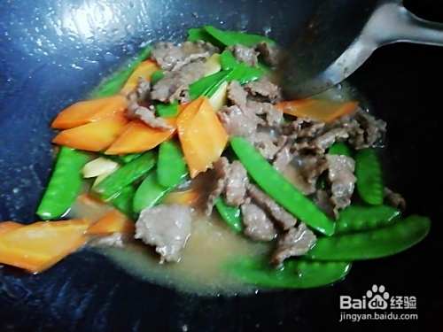 放入荷兰豆和胡萝卜炒匀,撒入少许盐炒匀,即可出锅享用。