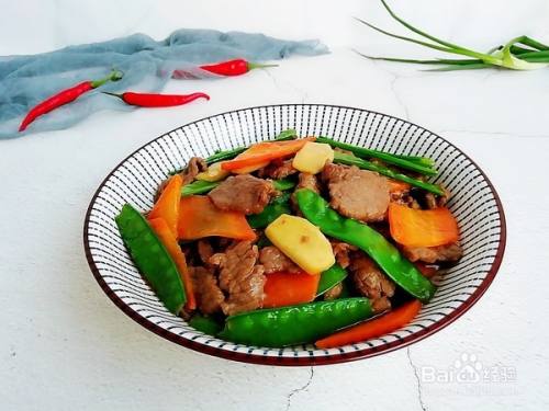 准备牛肉一块,胡萝卜一根,荷兰豆一把清洗干净控水备用