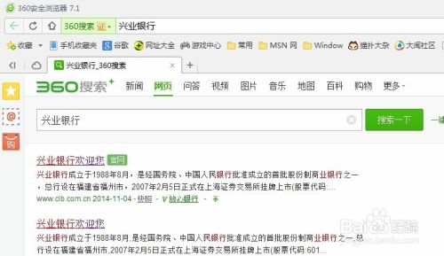 1、首先,打开浏览器,360搜索(百度等)输入兴业银行,点击兴业银行欢迎您进入兴业银行官网。