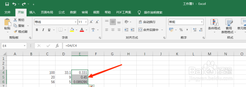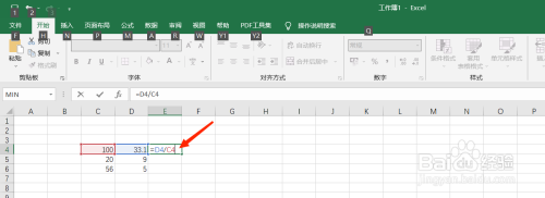 在输入数据后,以图中为例子,在所需为百分比的单元格输入=D4/C4(即除法的公式,某个单元格的数据除以另一单元格的数据)。