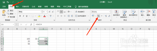 在excel的日常使用中,经常需要得到百分比的数据。在需要百分比的一栏输入除法的函数,再选中单元格,在开始一栏找到百分比的图标,点击即可获得百分比数据。