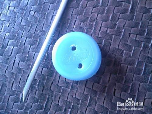 用锥子在饮料瓶盖的上面钻两个小孔。