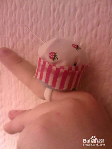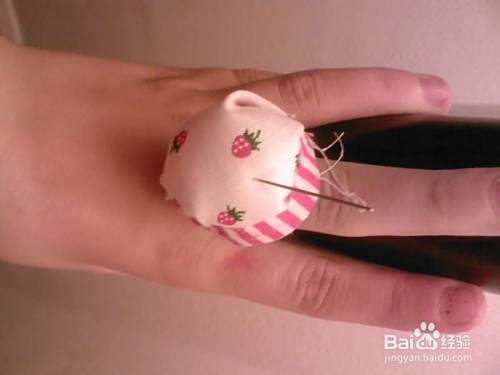 用剪刀再剪一个小长条布,用胶水沾在瓶盖外侧,然后用针线把长条布和圆形布缝合一起。漂亮的戒指型针插就完成了。