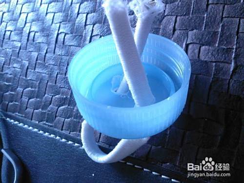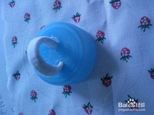 用剪刀剪一段松紧带,然后从瓶盖的上面串进瓶盖的小孔里。如图所示。