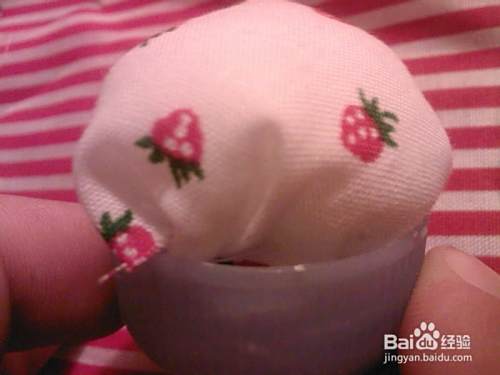 把剪好的圆形沿着边缘慢慢的塞进瓶盖里面,然后把剩下的碎布塞进圆布形里面。再用胶水把瓶盖和布的缝隙粘合。