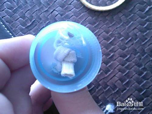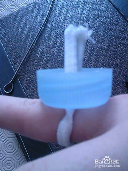 然后把带有瓶盖的松紧带戴在自己的手指上面,试下大小。然后在瓶盖里面把松紧带打结系紧。如图所示。