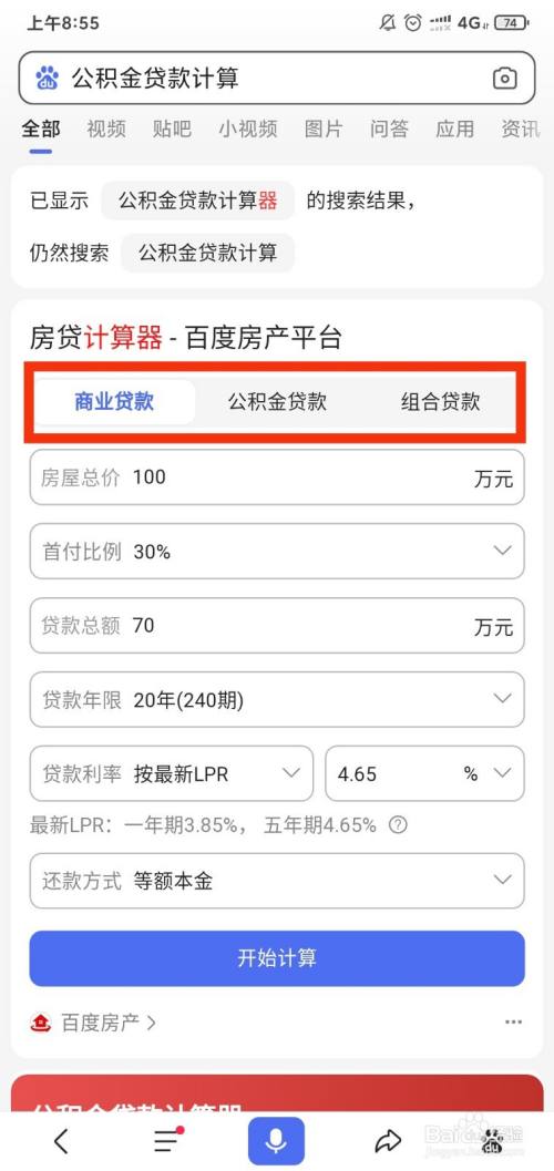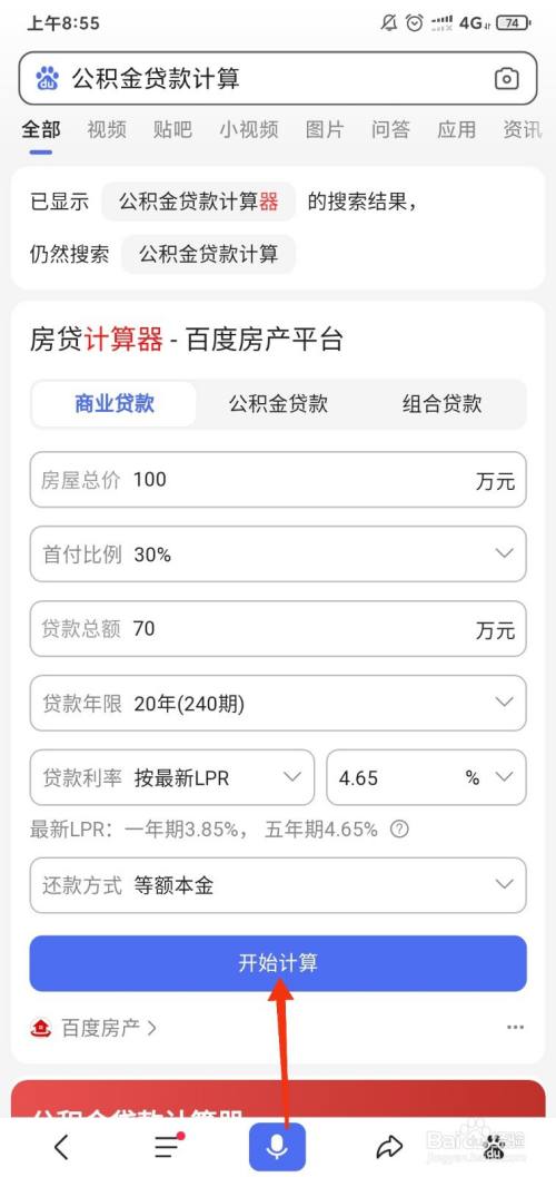 百度App搜索【公积金贷款计算】,会搜索出“房贷计算器”,可选择商业贷款、公积金贷款、组合贷款三种形式,根据你的贷款情况输入相应信息,即可完成计算。