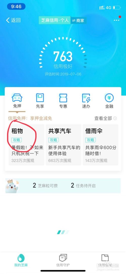 在芝麻信用页面中,会有一个“租物”,点击进入下一步操作。