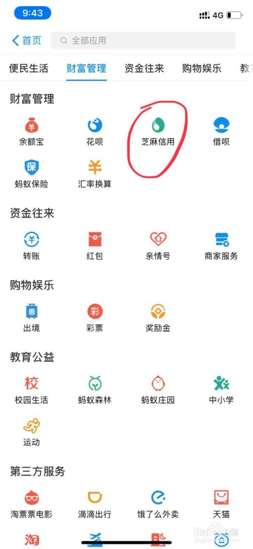 在全部应用页面中,找到财富管理中的“芝麻信用”。